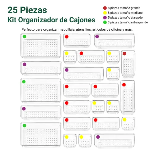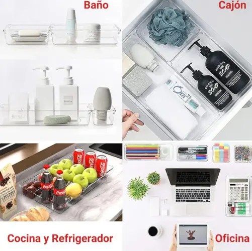 No todos los cajones son iguales, por eso este kit modular es la opción más inteligente. Gracias a sus diferentes tamaños, podés combinar las piezas como prefieras para que encajen justo en tu espacio. Su transparencia cristalina no solo aporta una estética limpia y moderna, sino que te permite localizar lo que buscás en un segundo, ahorrando tiempo y estrés diario.