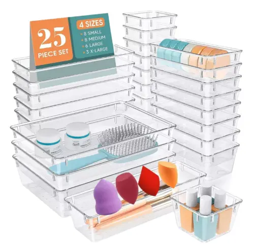 Transformá el caos en diseño. Este kit ultra completo de 25 organizadores modulares te permite personalizar cada centímetro de tus cajones. Fabricados en acrílico cristal de alta resistencia, son la solución definitiva para mantener cosméticos, oficina, cubiertos o herramientas perfectamente clasificados y siempre a la vista.